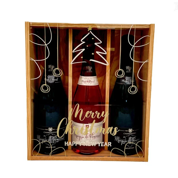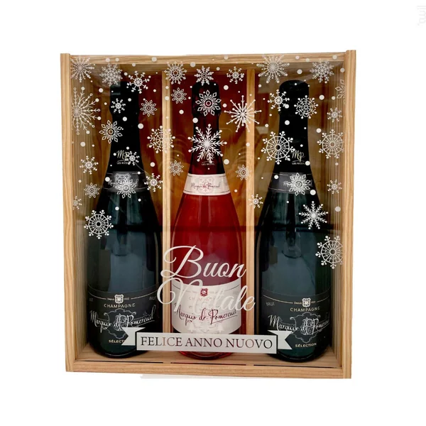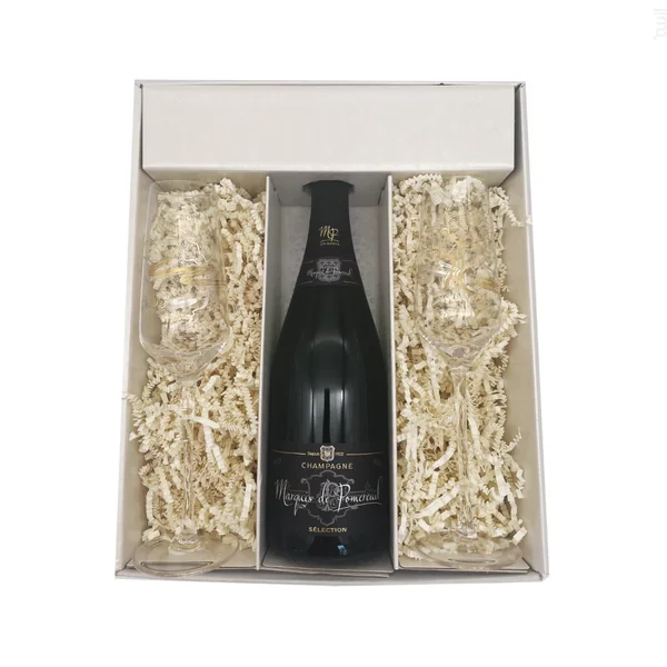 Coffret cadeau blanc – champagne marquis de pommereuil : motif blanc 1 bouteille marquis de pomereuil en 75cl 1 brut 1 pot de calissons 95g & 1 pot d’amandes enrobées 115g le petit duc